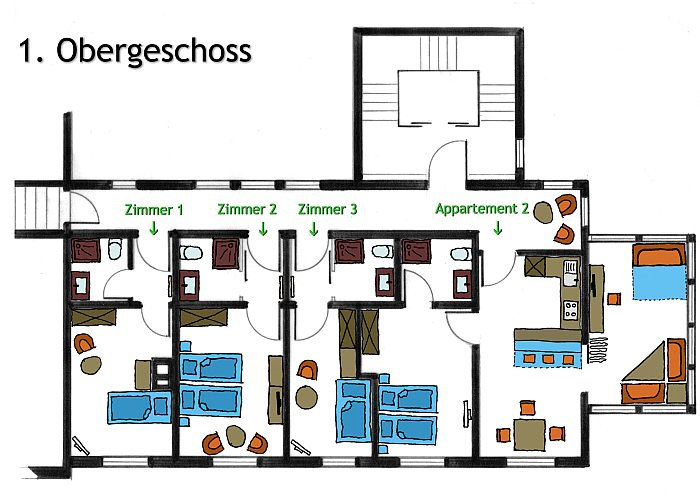 Zur Verfügung stehen verschiedene Einzel- und Doppelzimmer sowie Apartments und eine separate Ferienwohnung – jeweils mit eigener Dusche/WC, TV, Internet und teils eigener Küche. Details zu den Zimmern und Apartments finden Sie auf den jeweiligen Unterseiten.
